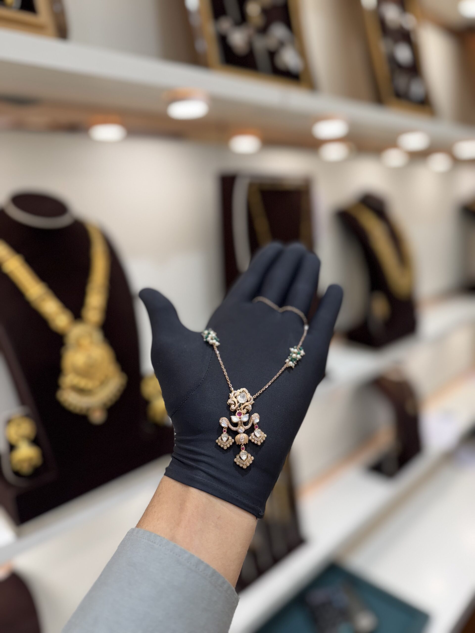A delicately crafted pendant necklace featuring a floral-inspired design in rose gold plating, embellished with shimmering Kundan stones and elegant pearl drop accents. Ideal for festive occasions and weddings, this piece adds a graceful and modern twist to traditional elegance.